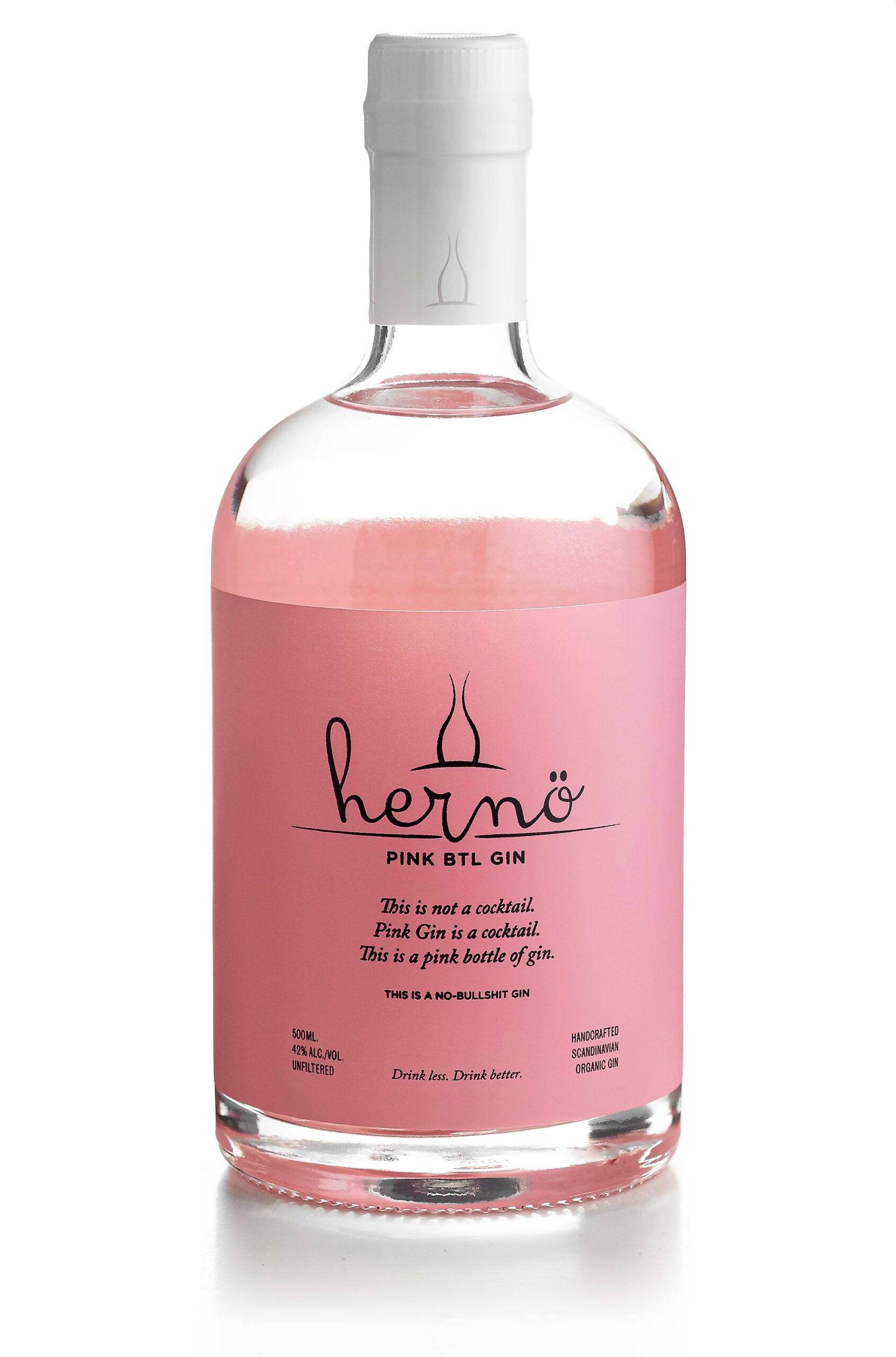 products that are riding on the increased interest in just gin, however, I am concerned that gin as a product and concept is watered out. More and more “gin” is emerging that tastes anything but juniper. That is why I agree with the crowd that demands greater compliance with the EU’s definition of what may be called just gin. Herno Pink Bottle Gin in April 2020 is contribution to the call not to destroy the gin’s heritage and history. It is a pink bottle of gin; the liquid is obviously transparent. A gin with fruity and floral notes that so many are asking for, and with a predominant flavour of juniper. We have actually used an extra amount of juniper in this product compared to our current products. To make sure we stick to what gin should be. This is a no bullshit gin.