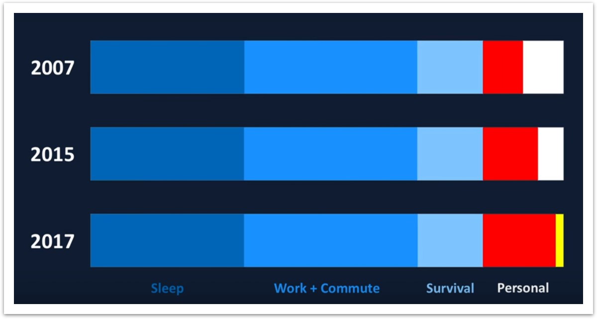 In 2007 Apple launched the revolutionary iPhone. The chart below shows a breakdown of the average person spending an average day. The red bar highlights the amount of time we spend staring at a digital screen. In 2017 it was approximately 90% of our free time.